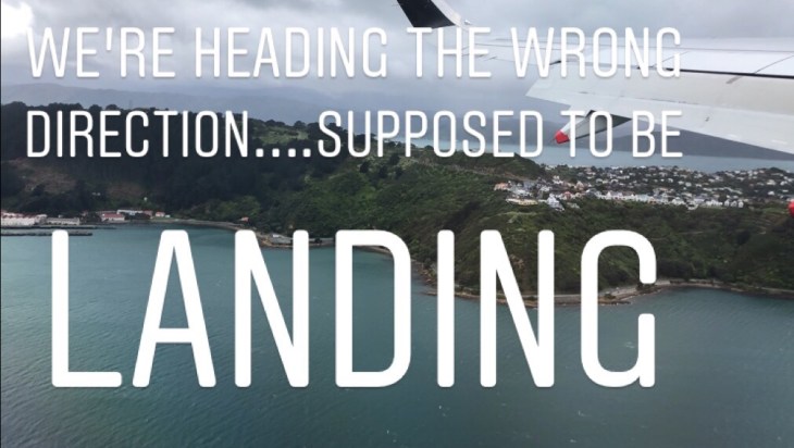 The flight was supposed to take 45 minutes from Christchurch to Wellington and we started our descent. And then something happened. Just as I was taking video of us flying over the water, the jets turn on and we start heading back up into the sky! As an American, my first thought was, terrorism. And how terribly sad if that is my worldview??! The flight attendant comes onto the PA system and tells us we’re going to have to make another approach to the airport. No other information. At this time, there’s some nervous chuckling and we’re still unaware of just why we can’t land.