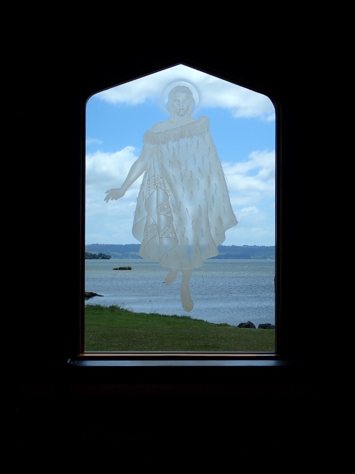 9am comes and I receive a text that his car has broken down. What are the odds?! But I still walk to meet him because one way or another, we’ll get to the village. We had a nice chat over hot chocolate while we waited for his niece to drop off a spare car and for a tow truck to take his car to the shop. Once were on 4 wheels, he proceeds to drive me around pointing out things of interest and giving me full history of the Maori people – including the folklore (which has always been my favorite parts of history). Those who know me know that I’m not religious at all, but we stopped in a church and even a “heathen” like me can appreciate when something is beautiful. Like this window you can look through while sitting down on a pew in an Anglican Church. He’s really walking on water. 😉
