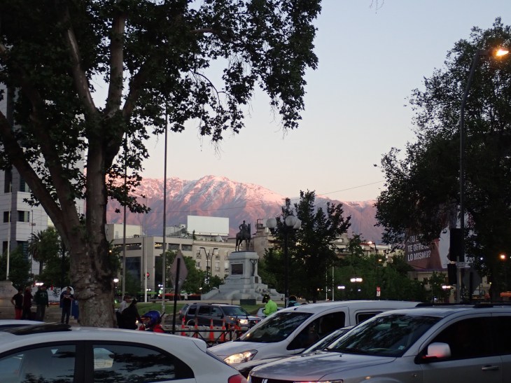 I leave my hotel at 8pm and it’s still light outside, the sun is just starting to set. I walk to a popular neighborhood and have to walk through a park that smelled like weed and had all kinds of people selling things. No biggie. I’m glad I look the part of a Latin American. I don’t think I’m a target as much in these cities, however, I still keep my wits about me. I captured the Andes with snow in the background and thought they were so beautiful. Tomorrow I’m hiking up to a point where I should be able to see them during the day but they are certainly majestic even on a busy street in Santiago.