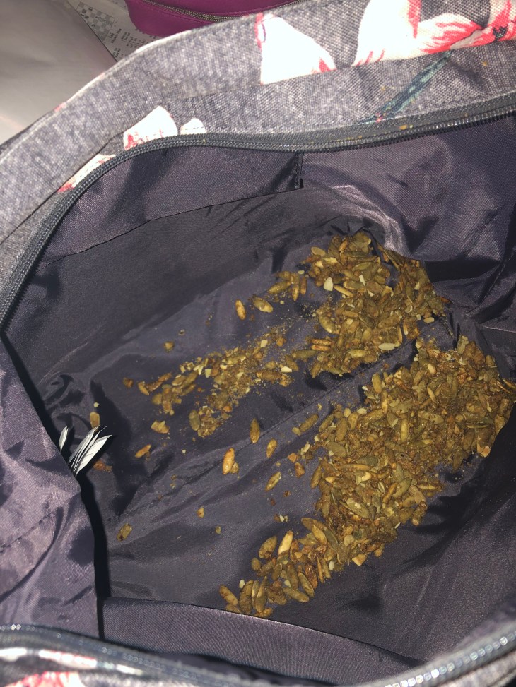 What’s that you ask??! Well, I forgot to close the bag of pumpkin spice pumpkin seeds and they spilled all over my bag. Not cool. I blame that woman.