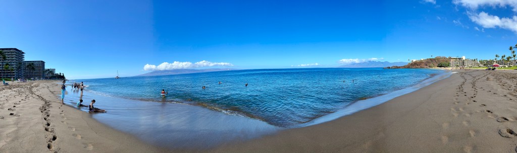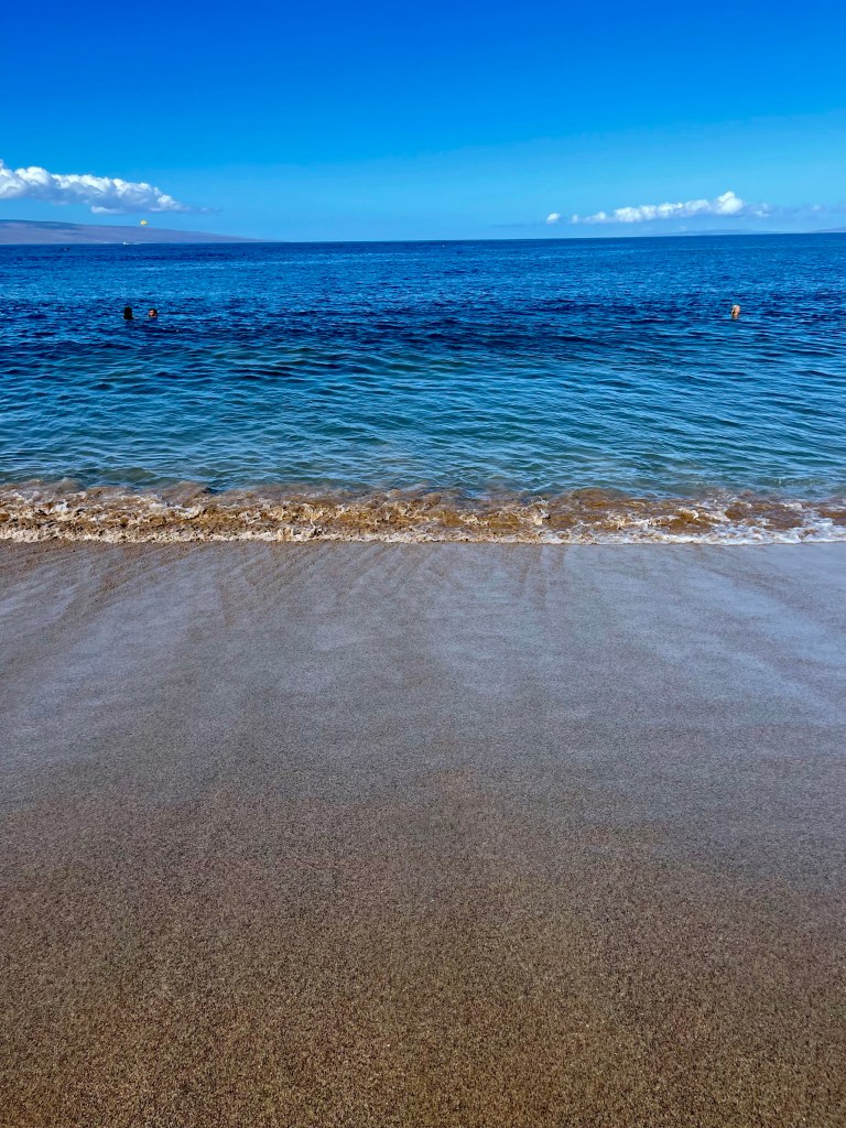After returning from my walk, I put on a bathing suit to head to the beach. I was disappointed to see the red flags lining the shore (swim at your own risk/no lifeguard). So I put my towel down and stuck my feet in the water. One minute the water was calm and the next a large wave splashed my shorts wet. Yep, not gonna get in the water. I did manage to write the introduction to my novel while sitting on the beach so it wasnāt all wasted. Here are some pictures from KÄāanapali beach.