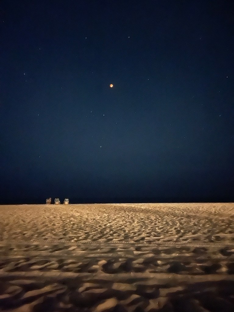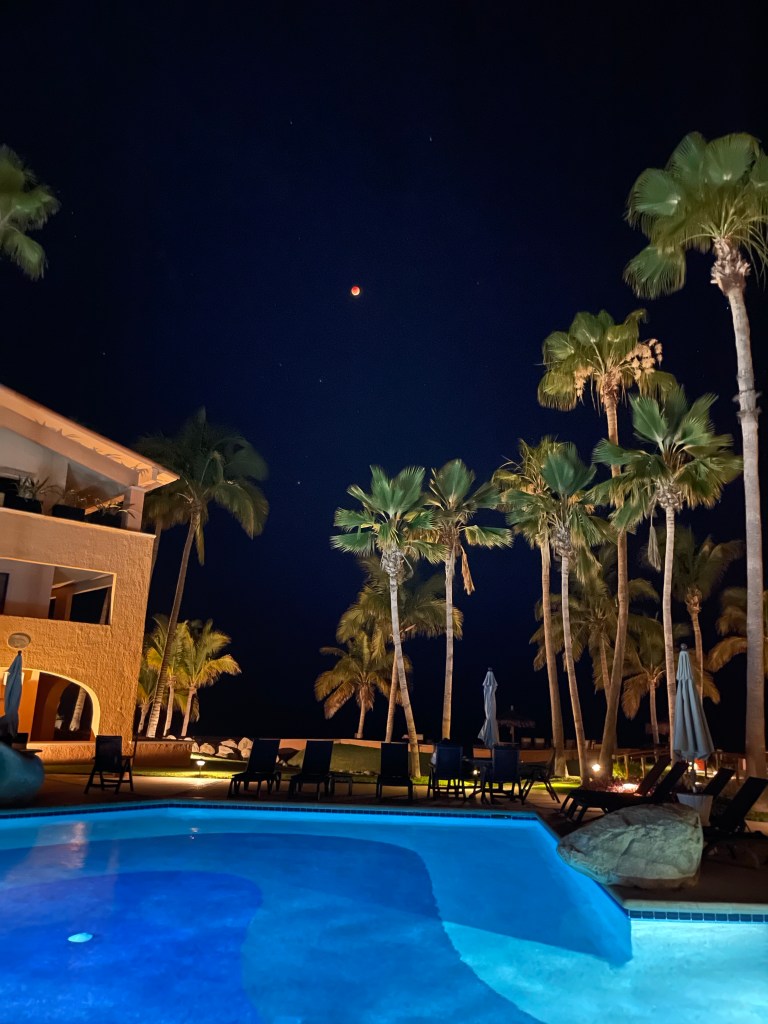 Last night was a total lunar eclipse on a blood moon! And this super astronomy nerd girl was going to see the lunar eclipse no matter what. So while we’re still taking it very easy and avoiding people/crowds and re-infections, Mom and I decided to sit on the beach and watch from a safe distance. No telescope required to see this majestic sight. And no speaker needed to hear some crazy woman yelling at the top of her lungs about some wrongs against her & promising never to come back to Mexico. She sounded drunk and we’re certain she was staying at the all-inclusive resort next door. We may (or may not) have tried to spy with the binoculars we brought out. But she wasn’t using her “indoor voice” so I call it a wash. Free booze + crazy lady = our very own beachside telenovela.