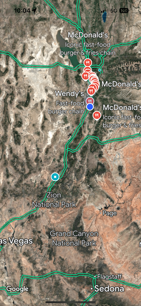 We left Riverton around 9am and had plans to check out Zion National Park before reaching Primm, the last stop of our 5+ state road trip. It was about 10:15am when I started to get hungry and after confirming that McDonald’s serves breakfast until 10:30 or 11a, I figured we’d see a few before breakfast hours stopped. I am convinced David put a curse on this trip as I can’t seem to be near a McDonald’s when I want a sausage egg McMuffin. This map shows my location (the infamous blue dot that my mom still uses to track my adventures even though I’m traveling with my husband) and all of the McDonald’s’ in the opposite direction to where we were headed. In a weird way, Utah and Mexico have some remote areas where even the Golden Arches aren’t found.