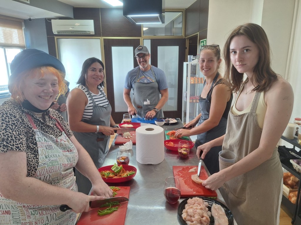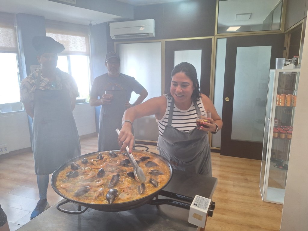 Ivan, our chef/teacher, then showed us how to make mixed paella with chicken, squid, shrimp (with the heads on), and mussels. I’m good with some of those ingredients. At least I wasn’t the Russian girl whose food allergy is vegetables—all of them. They just “gross [her] out.” There were eight of us, and everyone helped chop, stir, and pour. But no one did their job better than me (aka The Flipping Queen) because not only did I flip the shrimp excellently, but I did it with a glass of sangria in my hand. As one should!