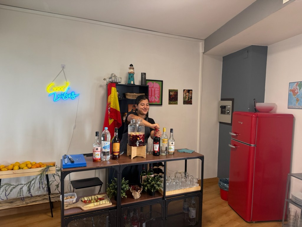For our last full day in Madrid, we booked a paella-making class with unlimited sangria. We met Sylvania (our host) on the street outside a tattoo shop with the rest of our group—including four other Americans. One of the students was a claustrophobic woman from New York who had a panic attack during the elevator ride up to the cooking classroom. Poor thing was stressing out the whole way! Once she escaped our elevator death trap, and in true New York, straight-talking fashion, she relayed her story to her travel companions, explaining how she was sweating so much that her “eyebrows might fall off.”