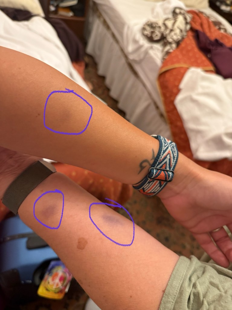 We took photos and video before we left the underground chamber and thought they looked pretty eerie with these dolls scattered along the back of the dark room. It wasn’t until we got home that both Mom and I found bruising on our left arms that left faded black ovals that reminded me of small (perhaps children’s) sooty fingerprints.