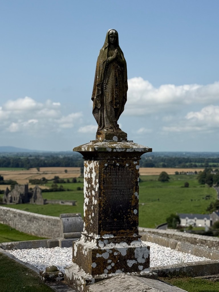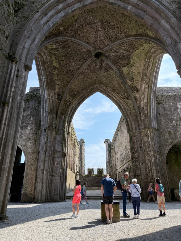 Leaving Tara’s house, we headed towards Rock of Cashel. Not sure what we’d be seeing, and since mom read the guidebook, we agreed. It was another ruin-ous structure with some frescos that sadly haven’t survived the test of time. Just like me/us — on the struggle bus for sure. We’re on the last legs of our trip, sick with head congestion and wanting to get home, especially David who is getting progressively sicker. Whenever someone is sick, I end up having to drive in a foreign country. Once in Mexico & now in Ireland.
